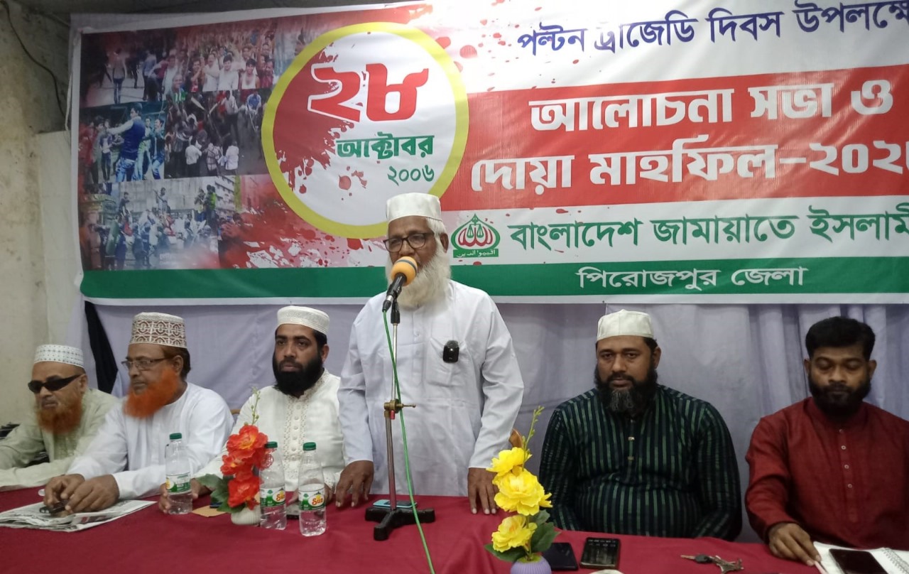পিরোজপুর অফিস।। ২০০৬ সালের ২৮ অক্টোবরের পল্টন ট্র্যাজেডি দিবস উপলক্ষে পিরোজপুরে আলোচনা সভা ও দোয়া মাহফিল অনুষ্ঠিত হয়েছে। মঙ্গলবার (২৮ অক্টোবর) বিকেলে বাংলাদেশ জামায়াতে ইসলামী পিরোজপুর জেলা শাখার উদ্যোগে এ কর্মসূচি পালিত হয়। জেলা জামায়াতে ইসলামী’র নায়েবে আমীর মাওলানা আব্দুর রবের সভাপতিত্বে অনুষ্ঠানে প্রধান বক্তা হিসেবে বক্তব্য রাখেন জেলা সেক্রেটারি মুহা. জহিরুল হক। বিশেষ অতিথি ছিলেন জেলা সহকারী সেক্রেটারি মাওলানা শেখ আব্দুর রাজ্জাকসহ স্থানীয় নেতৃবৃন্দ। বক্তারা বলেন, ২০০৬ সালের ২৮ অক্টোবরের পল্টনের মর্মান্তিক ঘটনাটি বাংলাদেশের রাজনৈতিক ইতিহাসে এক কালো অধ্যায় হিসেবে চিহ্নিত হয়ে আছে। ওইদিন ঢাকায় জামায়াতে ইসলামী ও ইসলামী ছাত্রশিবিরের নেতাকর্মীদের ওপর নৃশংস হামলায় বহু মানুষ প্রাণ হারান। বক্তারা নিহতদের আত্মার মাগফেরাত কামনা করেন এবং শহীদ পরিবারের প্রতি গভীর সমবেদনা জানান। আলোচনা শেষে শহীদদের আত্মার মাগফেরাত কামনা করে দোয়া মাহফিল অনুষ্ঠিত হয়। অনুষ্ঠানটি সঞ্চালনা করেন পৌর জামায়াত সেক্রেটারি মো. আল আমিন শেখ।